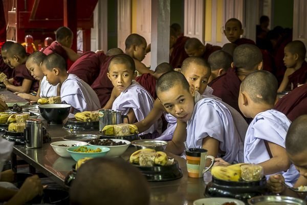 Cada niño entra en el monasterio o Kyaung como novicio entre los 6-8 años de edad en una ceremonia que se llama Shinpyu (como la primera comunión).En muchas zonas agrícolas del país son determinantes para el futuro, aprenden a leer y escribir, cada familia tiene por lo menos un pariente que es monje o monja en el clero. Pero está no es una decisión permanente, luego retornan a la vida civil y se transforman en los líderes de su comunidad.